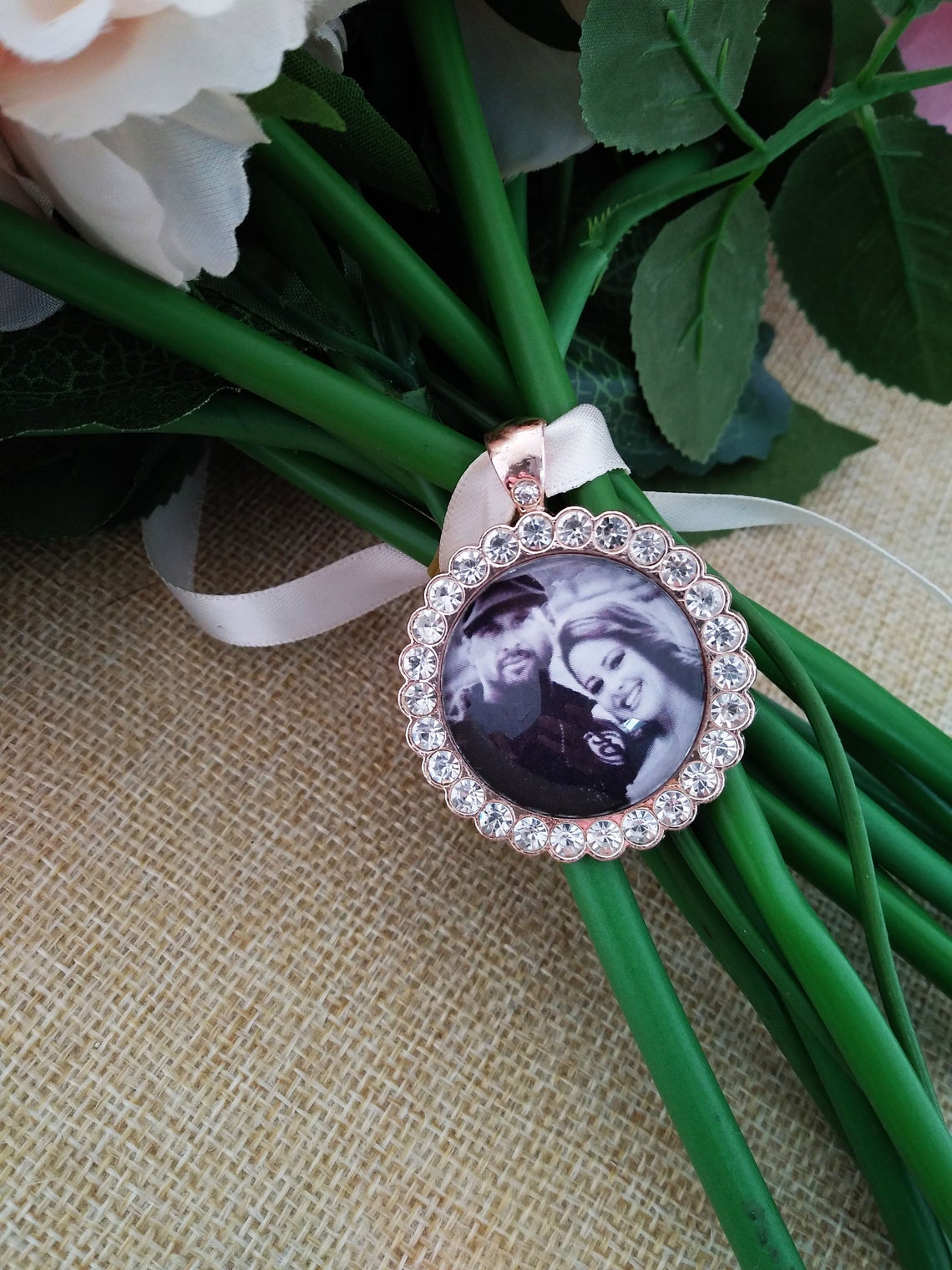 Listing is for 1 stunning rose gold charm with rhinestones, and comes with a choice of Ivory or White ribbon so you can tie onto your bouquet.