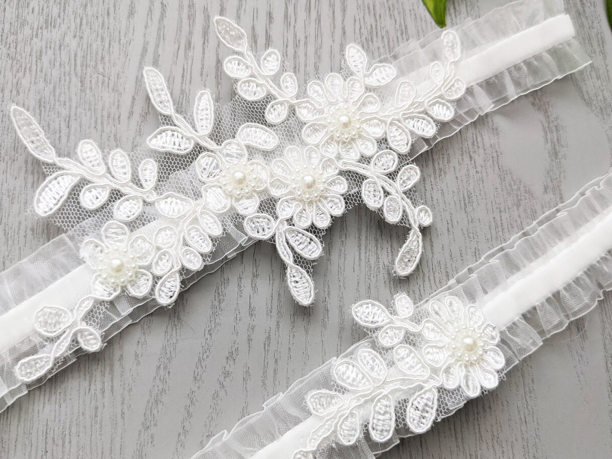 Choose Options Elegant White garter set - Babylon Design MSRP: Was: Now: $39.00 Our beautiful white lace garter set as pictured.Comes with a keepsake and toss garter. Lace is beaut…